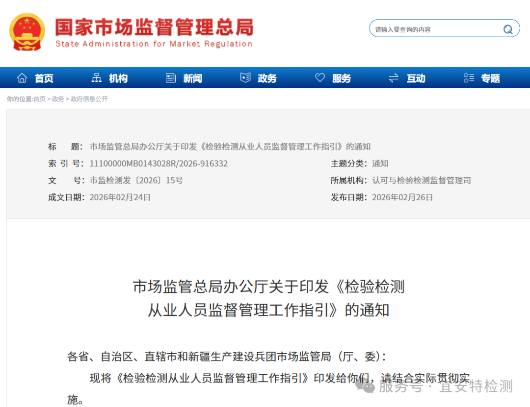 2026 年 2 月 24 日,国家市场监督管理总局发布新版《检验检测从业人员监督管理工作指引》,此次新规的核心,是把 “谁出证,谁负责;谁签字,谁担责” 落到实处,彻底终结过去 “机构被罚、人员换岗继续干” 的行业乱象。
