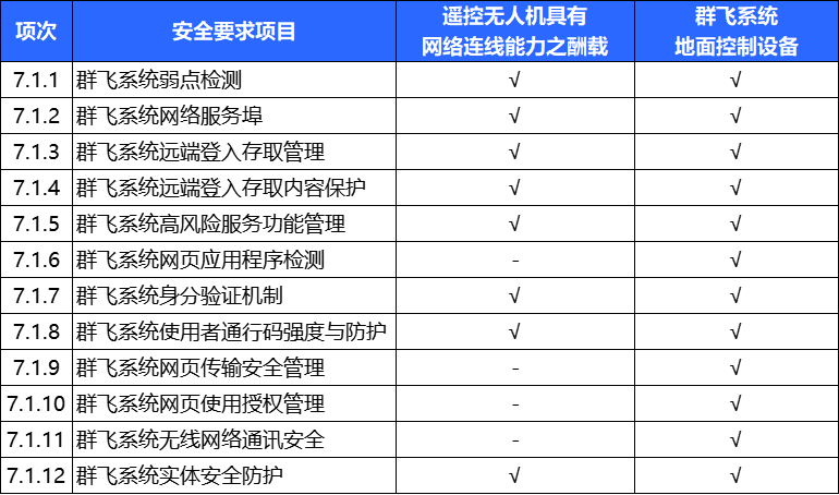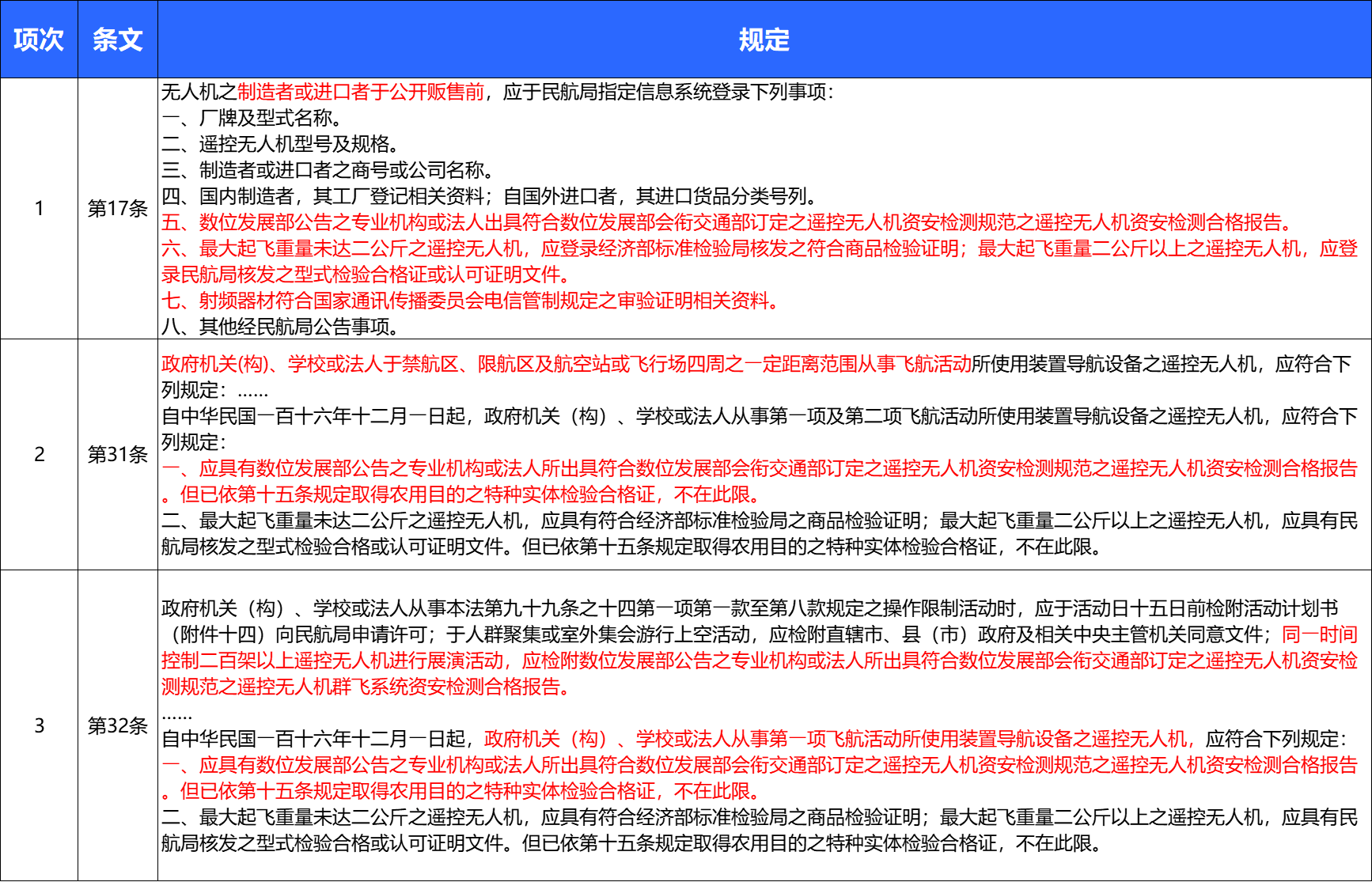 其中,无人机群飞展演活动实施日为2024年12月1日,公开贩售事项实施日为2025年12月1日,于禁限航区从事活动及从事限制活动实施日为2027年12月1日;制造、进口者及政府机关可依据该检测规范开展遥控无人机资安检测。