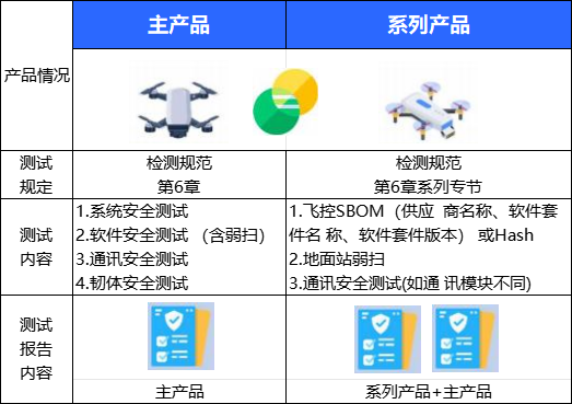 系列产品依据检测规范第6章系列专节测试,内容包括飞控SBOM(供应商名称、软件套件名、软件套件版本或Hash)、地面站弱扫、通讯安全测试(如通讯模块不同),测试报告为系列产品+主产品。