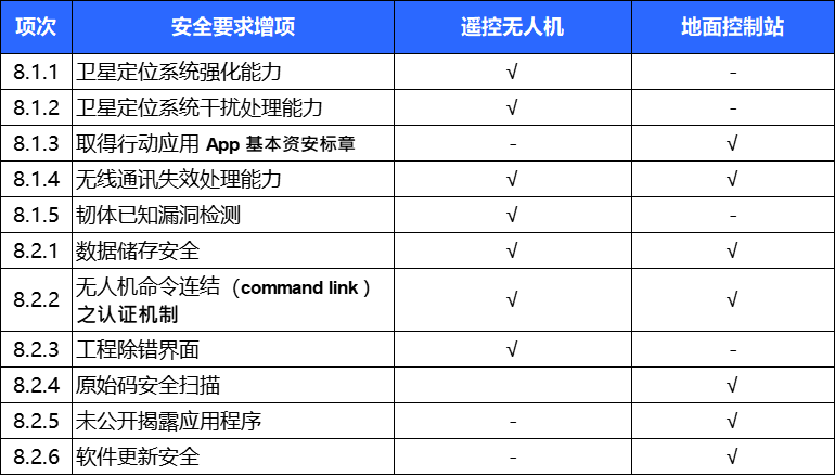 - 因应国防采购需求,可增加测试遥控无人机资安检测规范第8章,涉及卫星定位原始码等特殊安全测试。