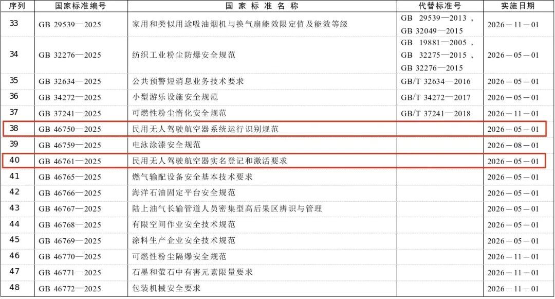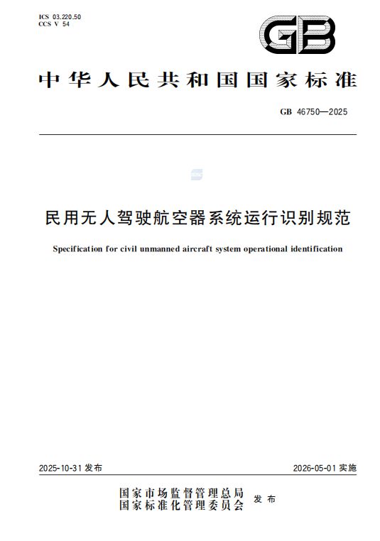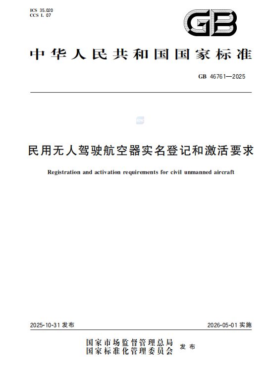 近日,国家市场监督管理总局(国家标准化管理委员会)批准发布了48项强制性国家标准,其中包含两项与无人机相关的重要标准:《民用无人驾驶航空器系统运行识别规范》(GB 46750-2025)和《民用无人驾驶航空器实名登记和激活要求》(GB 46761-2025)。这两项标准将于2026年5月1日起正式实施。