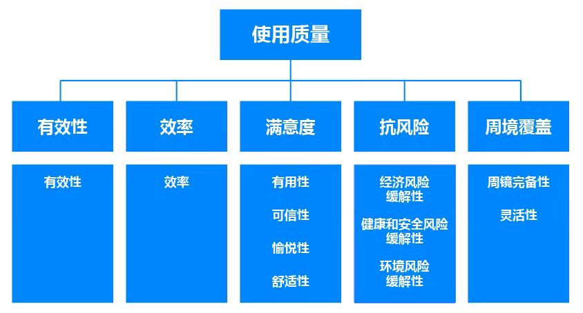 使用质量模型将使用质量属性划分为5个特性:有效性、效率、满意度、抗风险和周境覆盖(如下图)。每个特性都可以被赋予到利益相关方的不同的活动中,例如操作人员的交互或开发人员的维护。