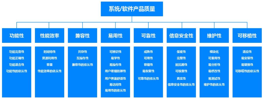 产品质量模型将系统/软件产品质量属性划分为8个特性:功能性、性能效率、兼容性、易用性、可靠性、信息安全性、维护性和可移植性。每个特性由一组相关子特性组成(如下图)。