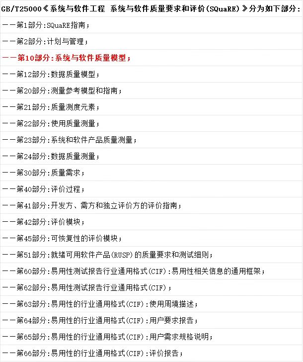 GB/T 25000是《系统与软件工程系统与软件质量要求和评价(SQuaRE)》的标准号。这是国际标准化组织 ISO/IEC 为统一软件质量评判标准而指定的软件质量度量和评价的标准。为软件质量的评价提供了全面的指导,它包含了21个部分,(如下图)。